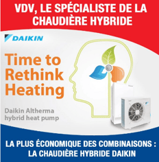 Daikin altherma hybride est l'association d'une pompe à chaleur ultramoderne à une chaudière à condensation gaz révolutionnaire ! 30 à 35% d'efficacité en plus par rapport à une chaudière gaz conventionnelle.
